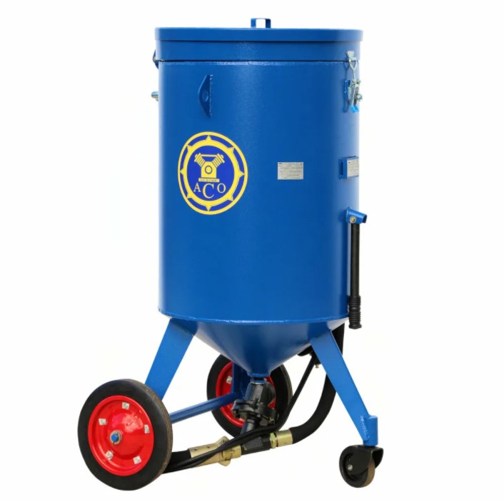 Есть мобильная конструкция с возможностью перемещения. Объем резервуара составляет двести литров. Производительность – от 4 до 20 кв.м./час. Модель оснащена дозатором шиберного типа для настройки интенсивности воздействия на поверхность. Плюсом работы пескоструя является возможность очищения удаленных участков, независимо от геометрии конструкции.
