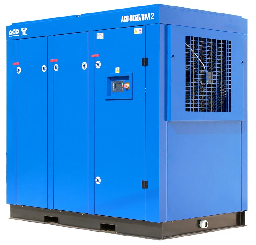 Компрессор винтовой АСО-ВК55/10М2 предназначен для производства и подачи сжатого воздуха. Производительность компрессора составляет 7,7 м3/мин. при максимальном давлении 10 атм. Винтовой блок приводит в движение электропривод мощностью 55 кВт. Компрессор работает в диапазоне температур от 5 до 40°С и имеет расход масла на унос не более 1 г/час. Уровень шума не более 80 дБа. Габариты установки составляют 226 х 130 х 195 см., масса 1100 кг.