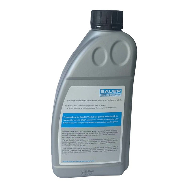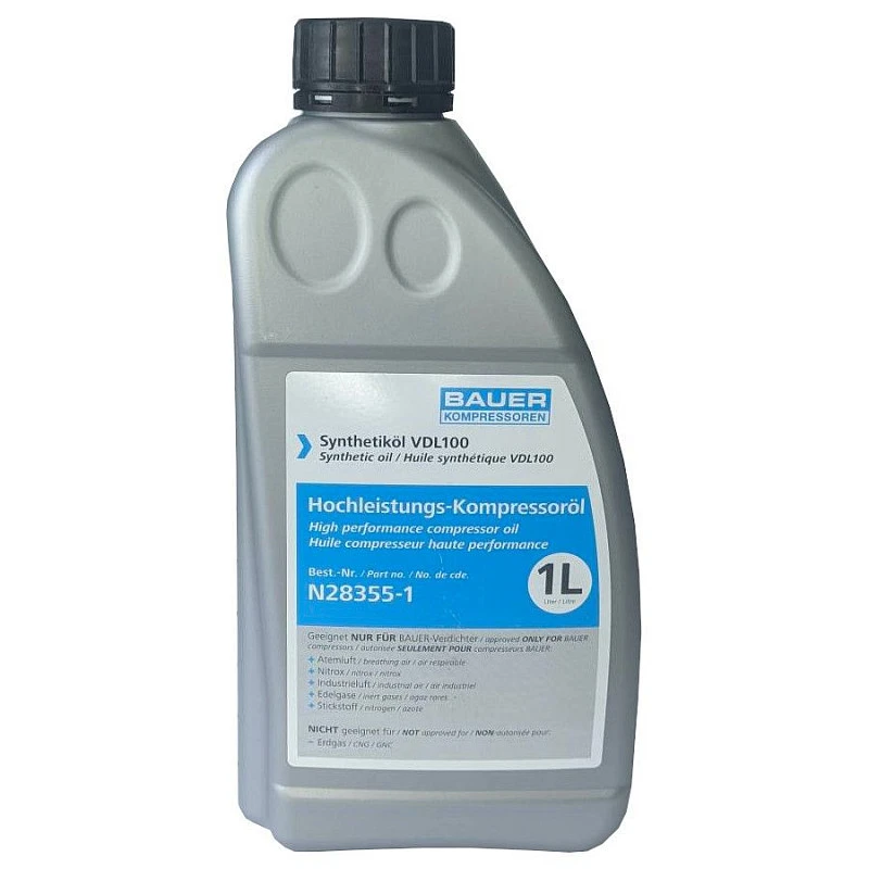 Компрессорное масло N28355 рекомендовано Bauer к использованию во всех современных агрегатах этого производителя, его основой служат многокомпонентные эфиры с добавлением эффективных моющих и анти окислительных присадок. Смазка сохраняет свойства и структуру при высокой температуре до 200°C, что является хорошим запасом, так как в компрессорном блоке температура, как правило, не превышает 90 градусов. Менять масло следует после 2000 часов работы, или каждые 2 года.
